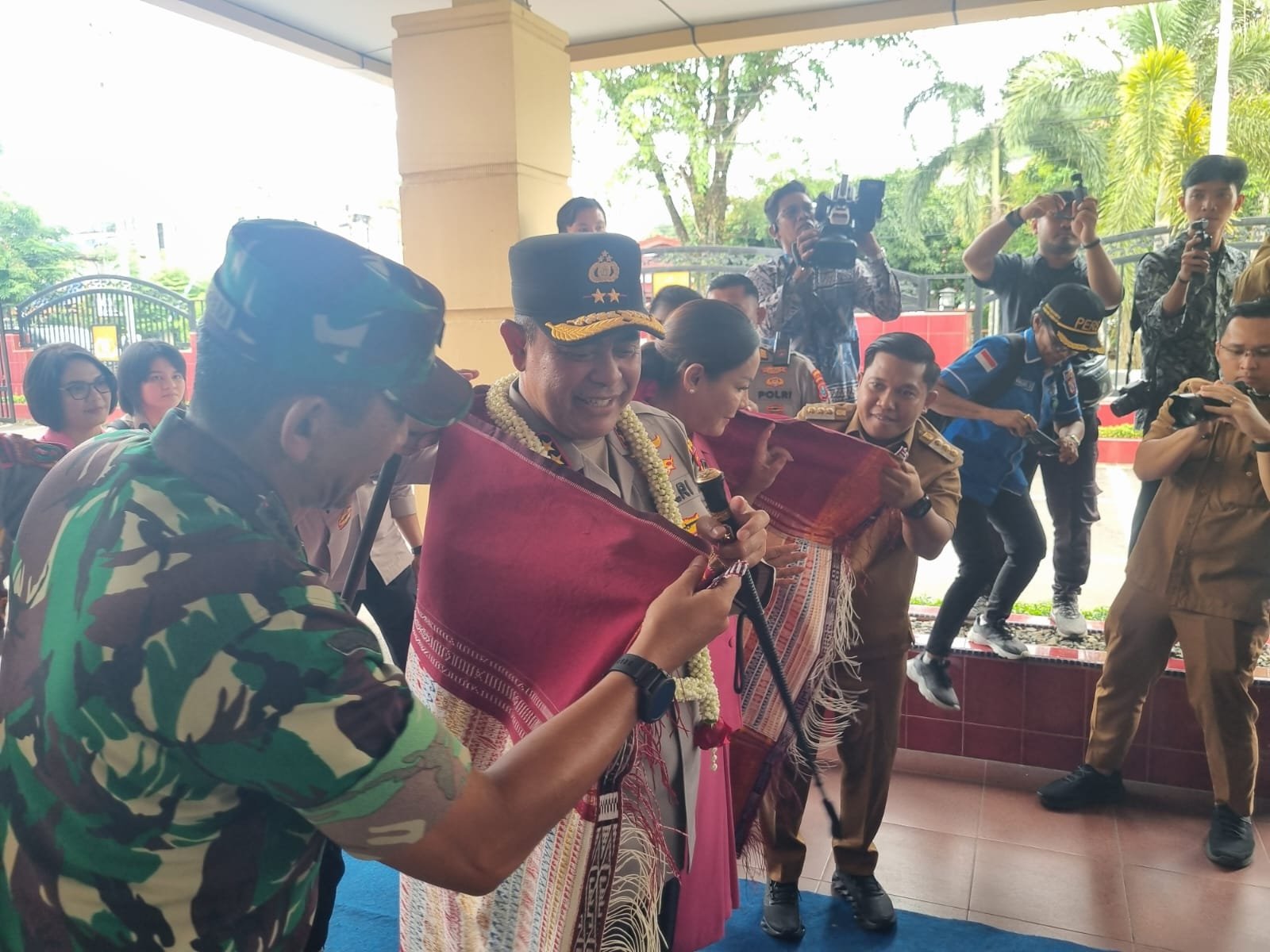 Penyambutan semakin meriah dengan pengalungan bunga dari anak-anak TK Kemala Bhayangkari serta pemberian ulos dari Pemerintah Kota Sibolga.