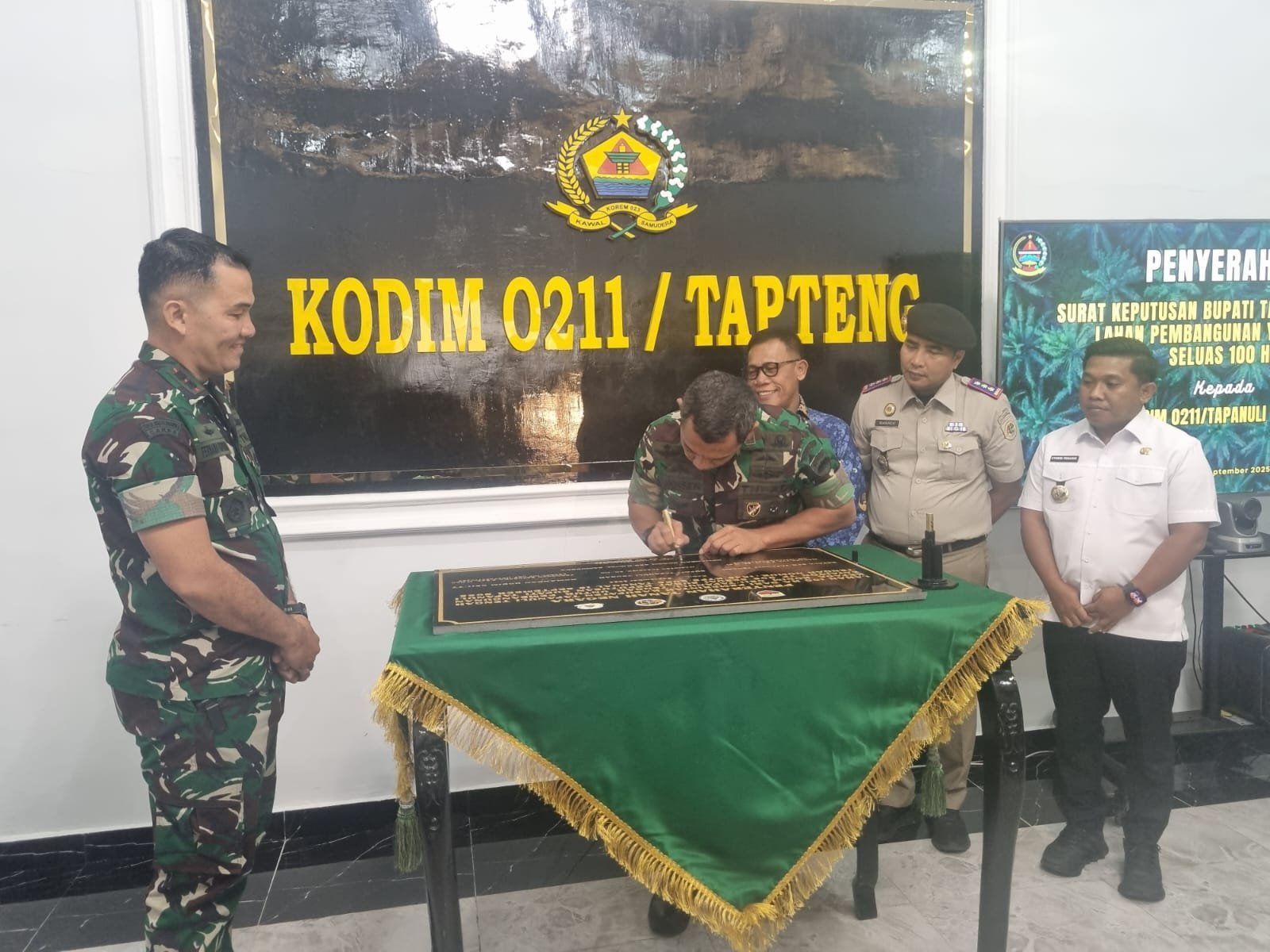Pemerintah Kabupaten Tapanuli Tengah (Tapteng) resmi menyerahkan lahan seluas 100 hektare kepada TNI AD untuk pembangunan Batalyon Teritorial Pembangunan (TP) 905. Penyerahan dilakukan melalui Surat Keputusan (SK) Bupati Tapteng Nomor 1845/KTPS/2025 tanggal 15 September 2025 dan berlangsung di Makodim 0211/TT, Senin (15/9/2025)