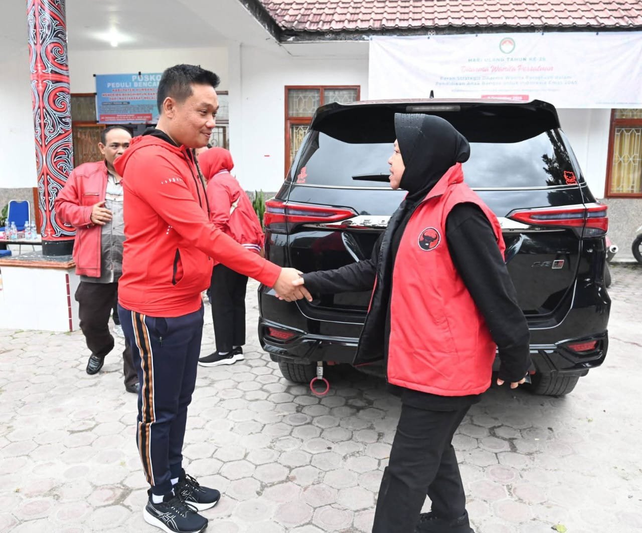 SAMBUT : Bupati Humbahas, Dr. Oloan P. Nababan SH MH saat menyambut kedatangan perwakilan PDIP, Ganjar Pranowo, di Posko Peduli Bencana Alam, Dinas Sosial Kabupaten Humbahas, Selasa (9/12/2025).
