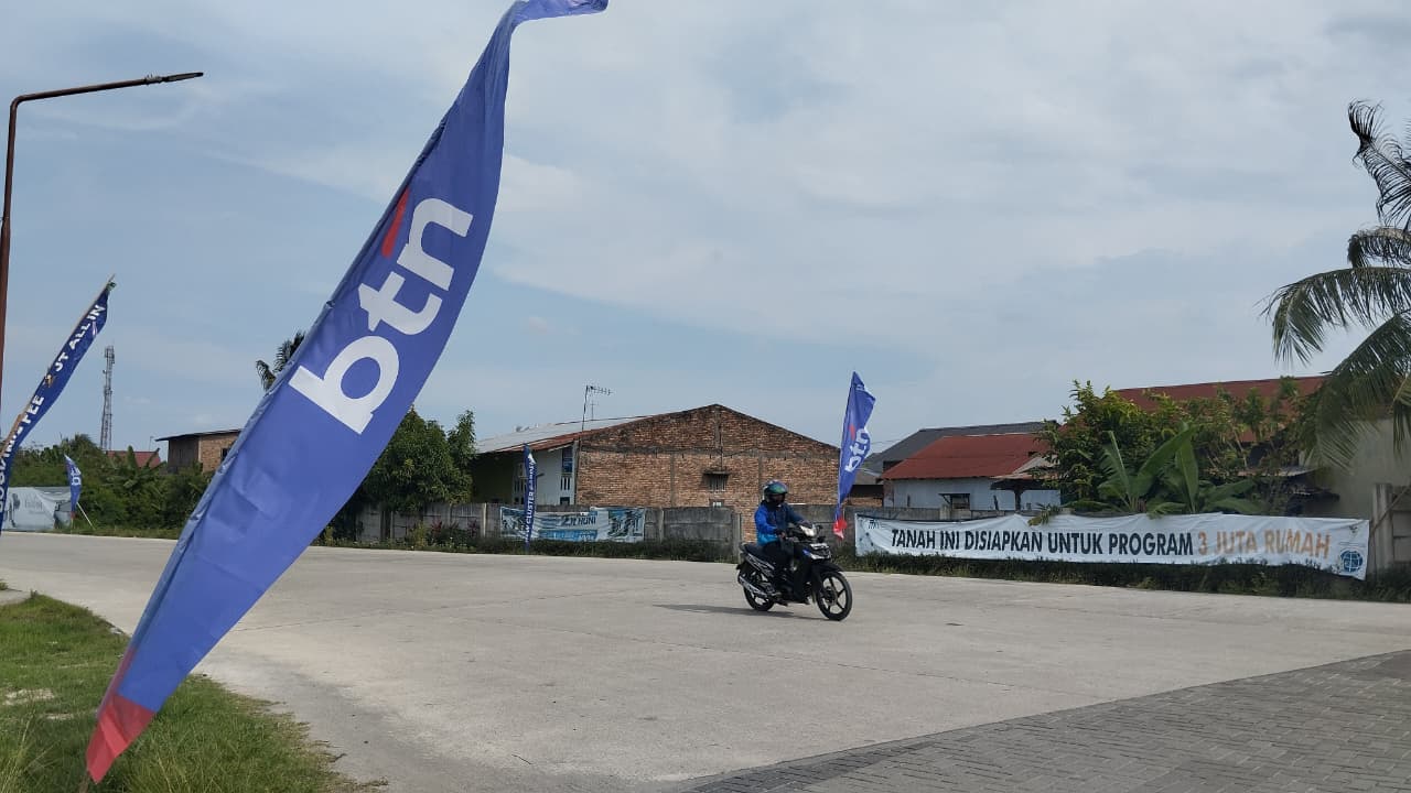 UMBUL-UMBUL: Pengendara sepeda motor sedang melintasi jalan yang dipenuhi umbul-umbul PT Bank Tabungan Negara (BTN) di kompleks perumahan yang ada di Kecamatan Medan Labuhan, Sumatera Utara, Jumat (20/2/2026). (Foto harianSIB.com/Christopel Naibaho)